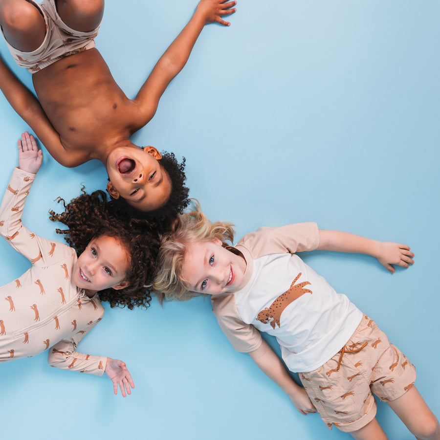 Das leichte Material besteht aus recycelten Stoffen und fühlt sich angenehm weich und atmungsaktiv an. Es trocknet nach dem Schwimmen schnell. Der integrierte UPF50+ Schutz bewahrt Kinder zuverlässig vor schädlicher UV-Strahlung und gibt Eltern ein gutes Gefühl. Die kurzen Ärmel sorgen für zusätzlichen Komfort und Bewegungsfreiheit – ideal für Kinder, die gerne aktiv sind.